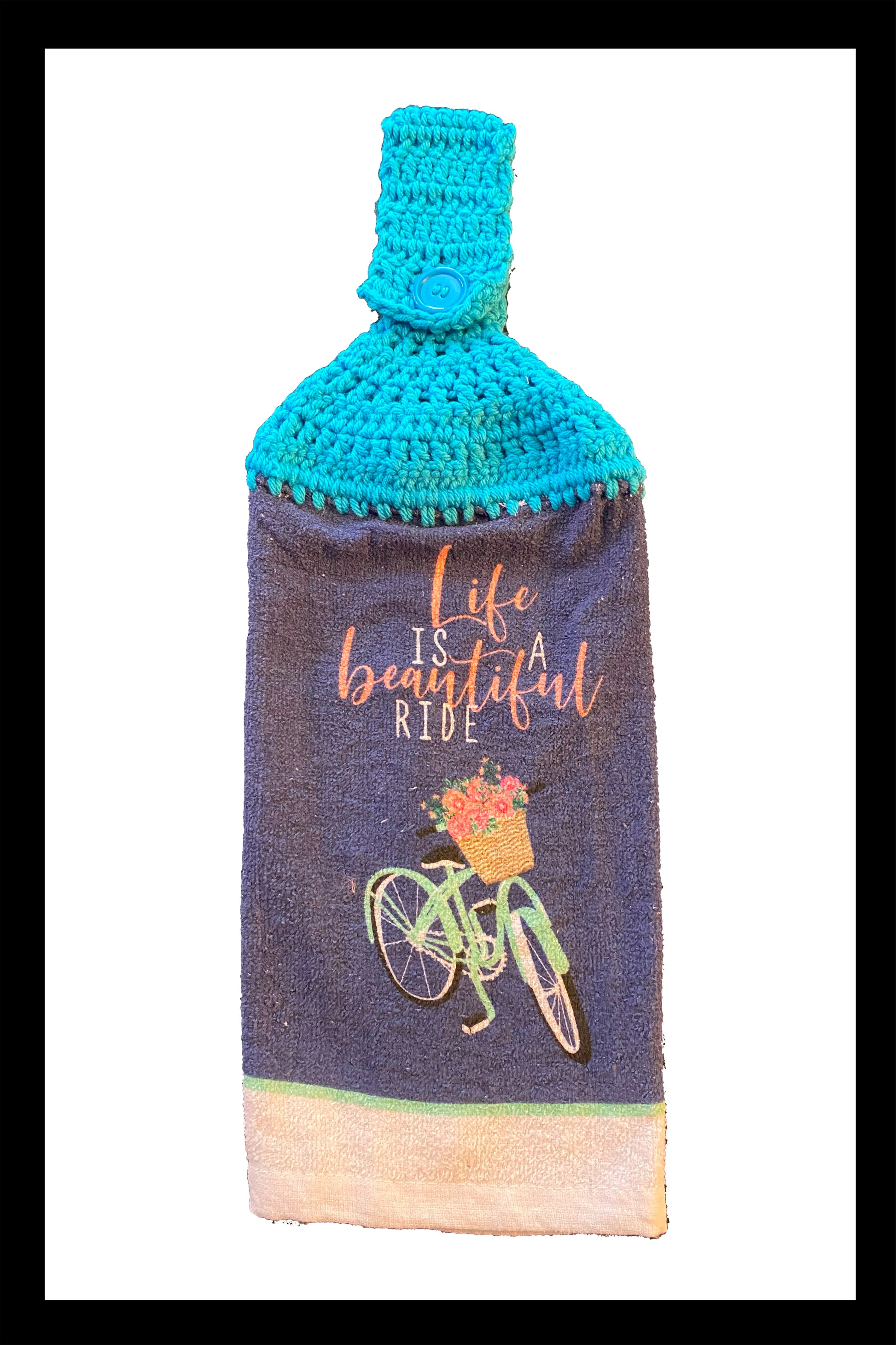 Kitchen towel with a crocheted hanger saying "Life is a Beautiful Ride” with a bike and flowers.