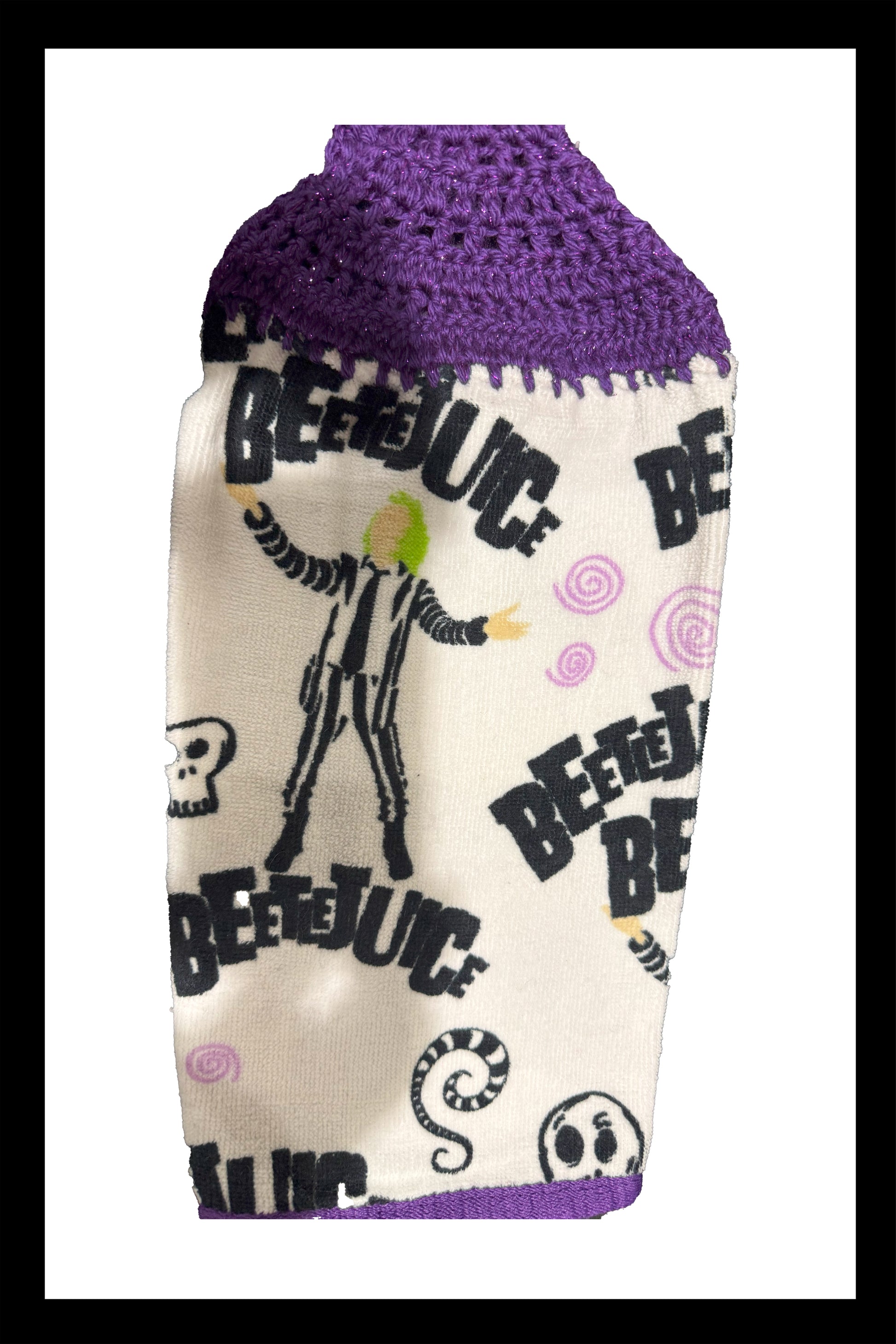 Kitchen towel with a crocheted hanger saying "Beetlejuice” with beetlejuice.