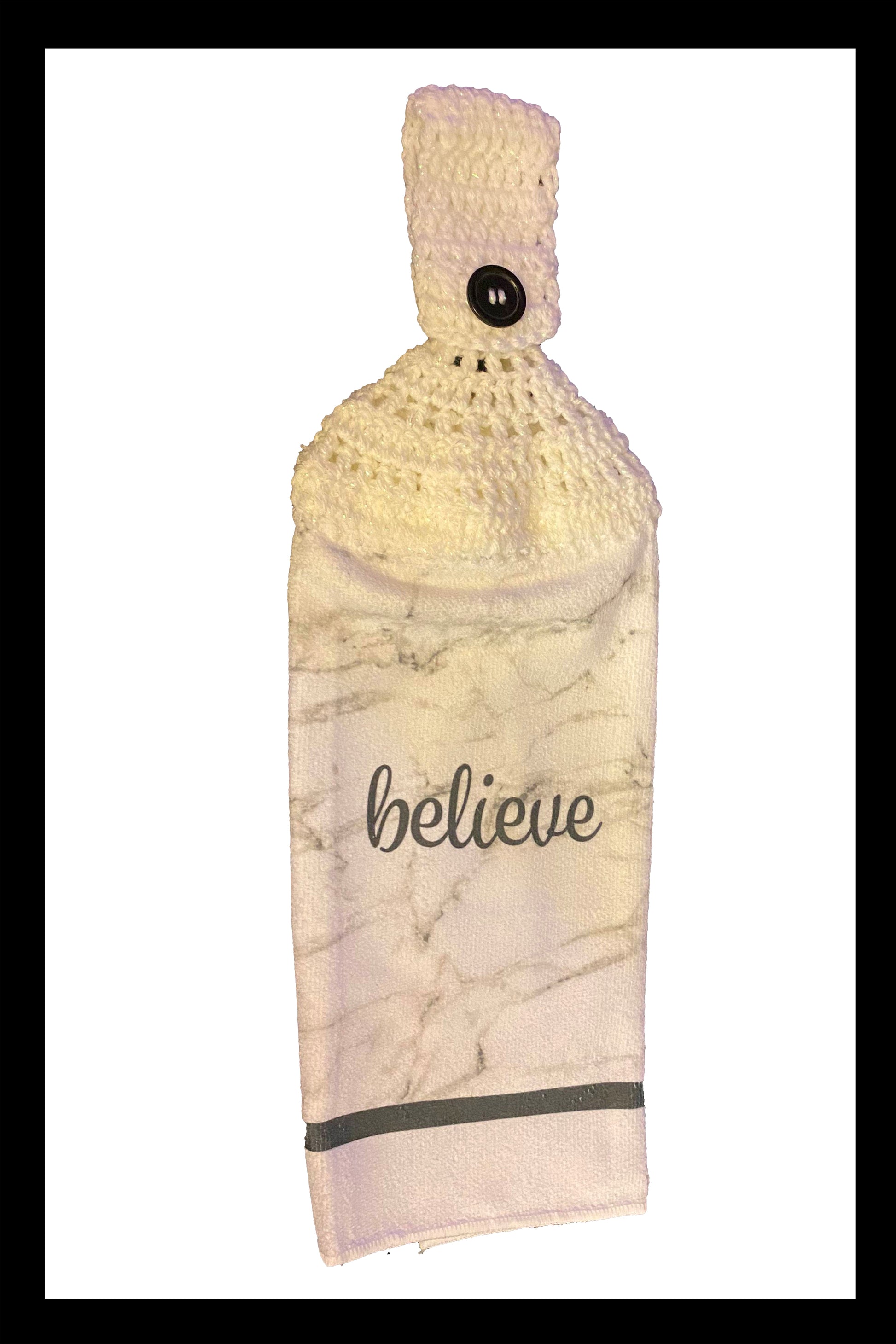 Kitchen towel with a crocheted hanger saying "Believe"