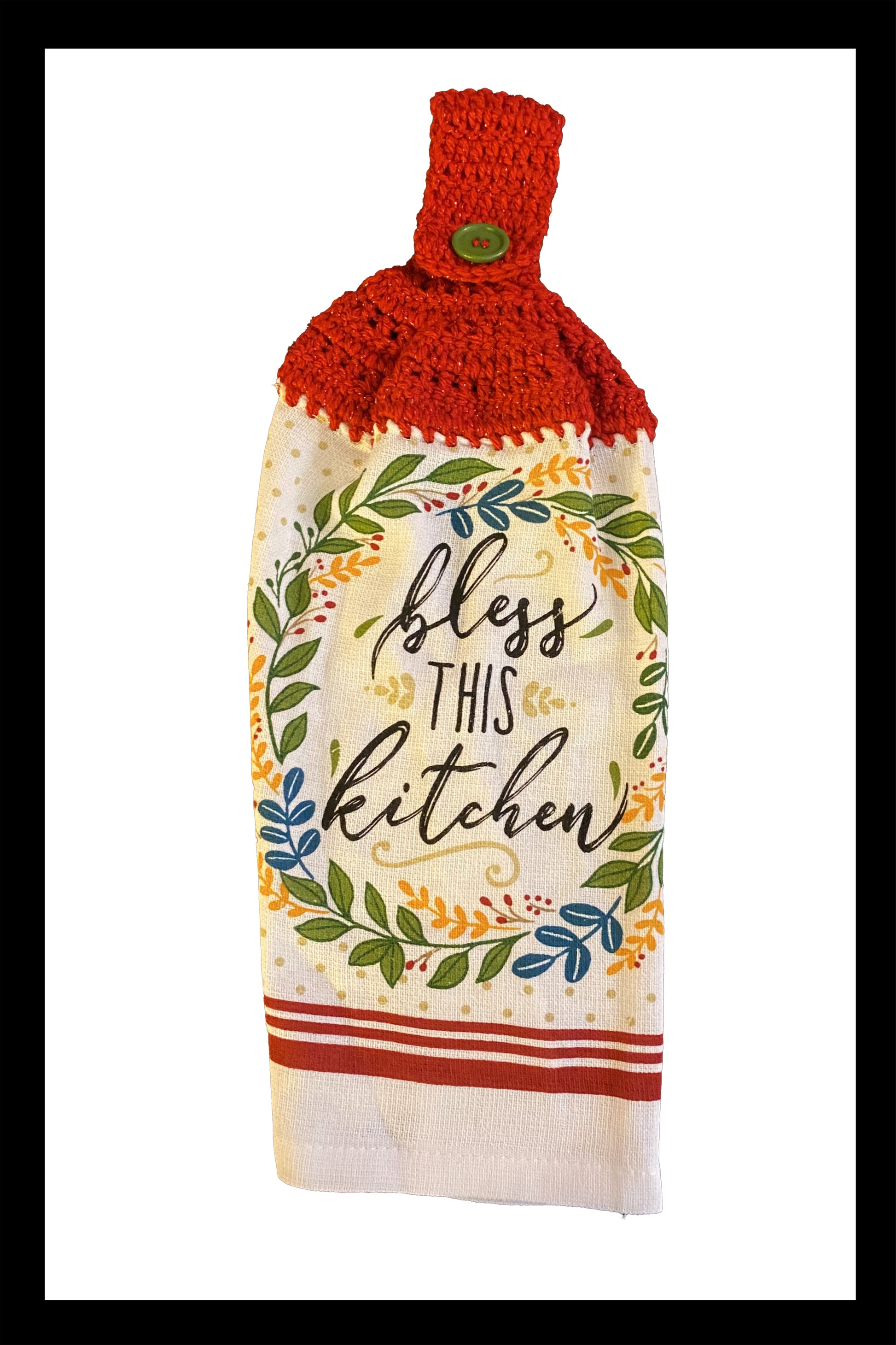Kitchen towel with a crocheted hanger saying "Bless this Kitchen" with flowers.