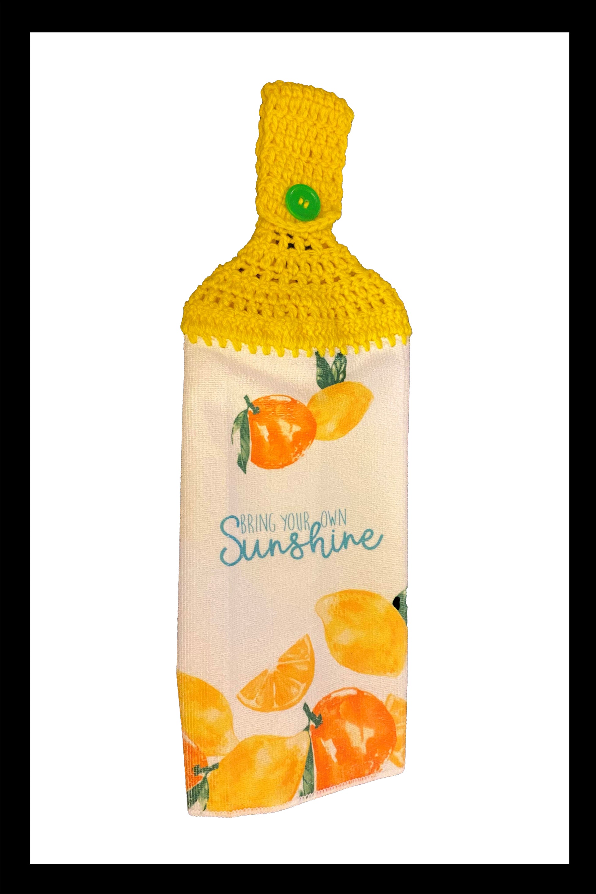 Kitchen towel with a crocheted hanger saying "Bring your own Sunshine" with lemons and oranges.