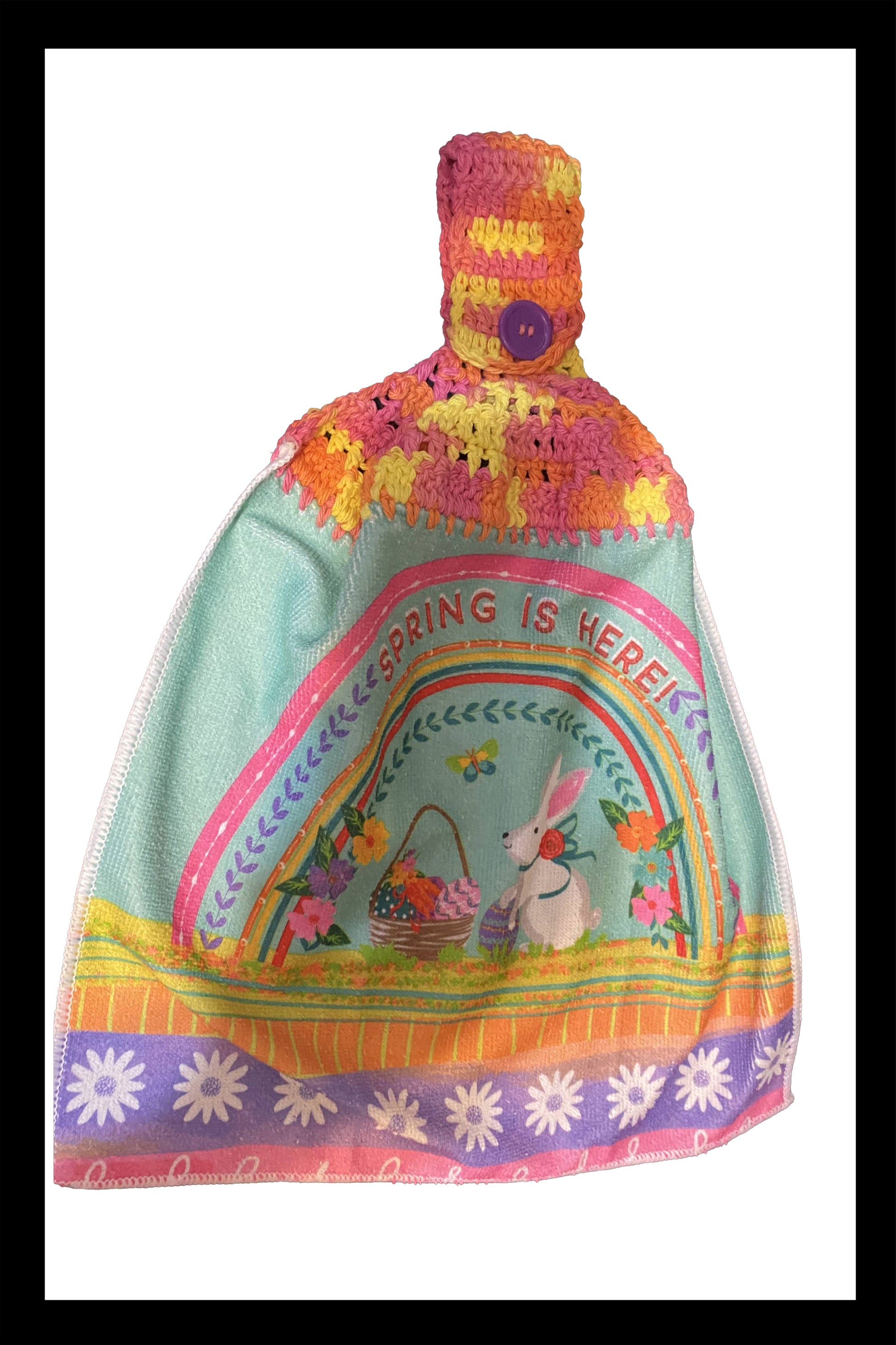 Kitchen towel with a crocheted hanger saying "Spring is Here” with a bunny and a basket full of eggs.