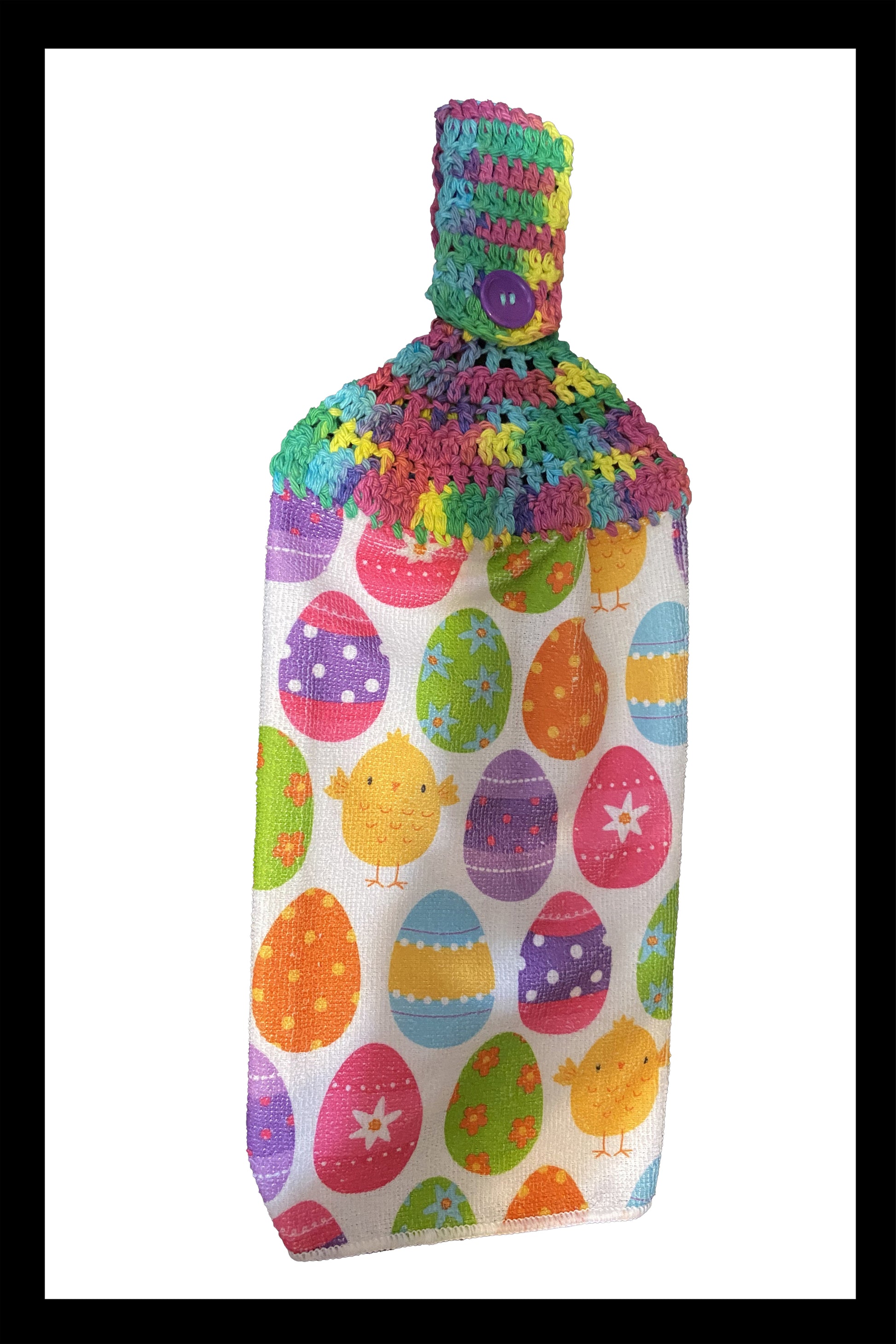 Kitchen towel with a crocheted hanger with chicks and eggs.