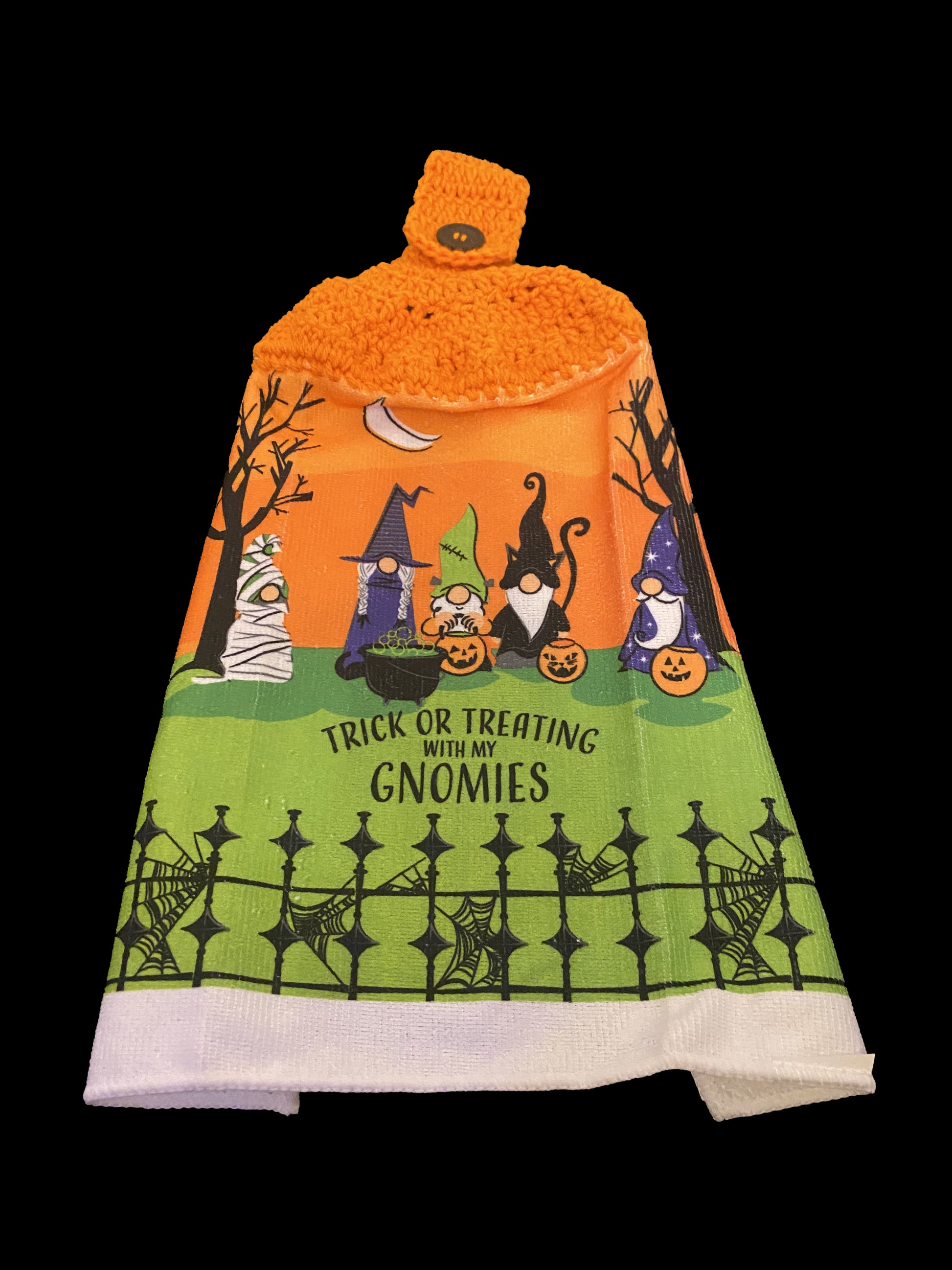 Kitchen towel with a crocheted hanger saying "Trick or Treating with My Gnomies” with Gnomes in Costumes.