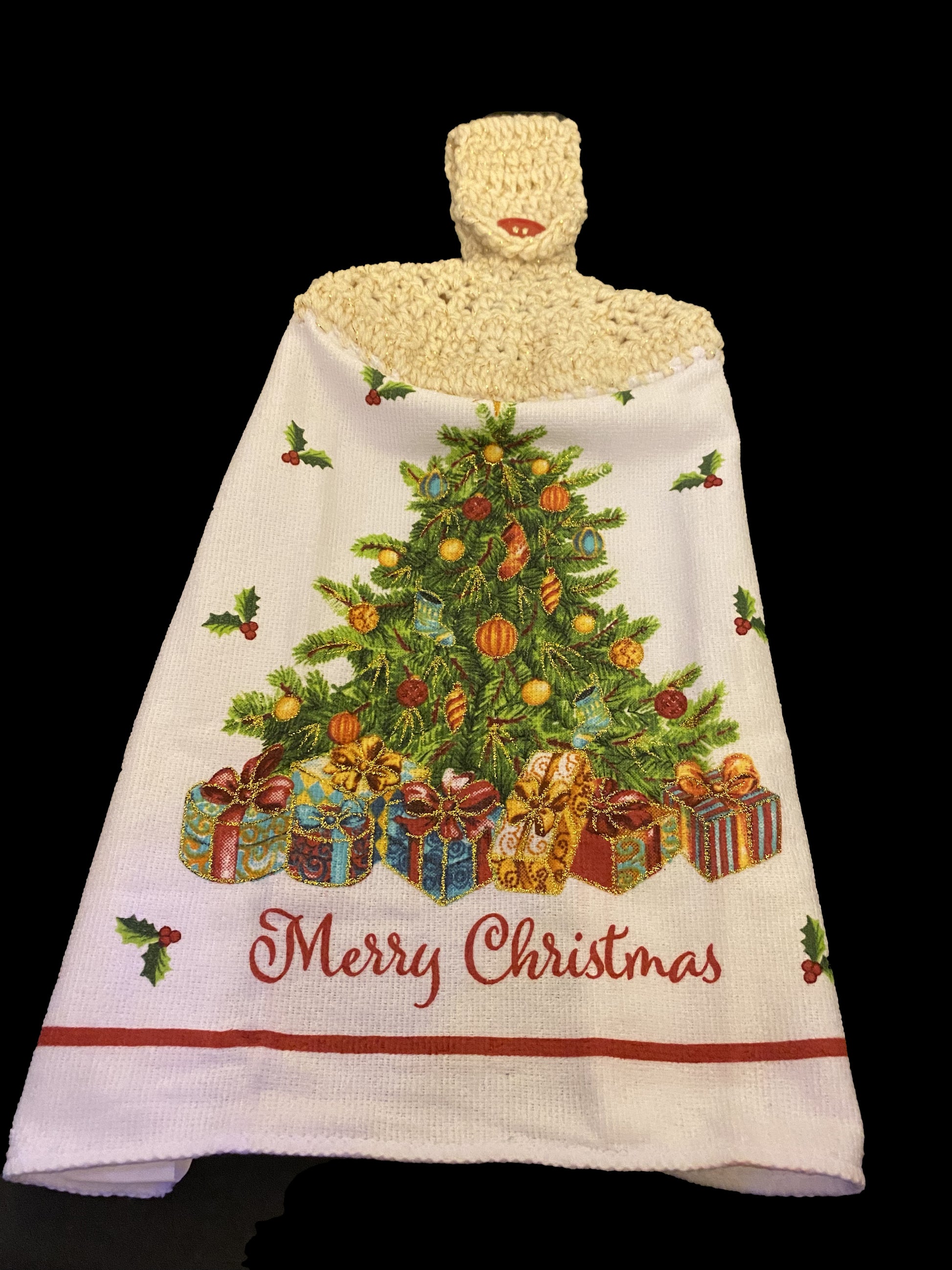 Kitchen towel with a crocheted hanger saying "Merry Christmas” with decorated Christmas tree.