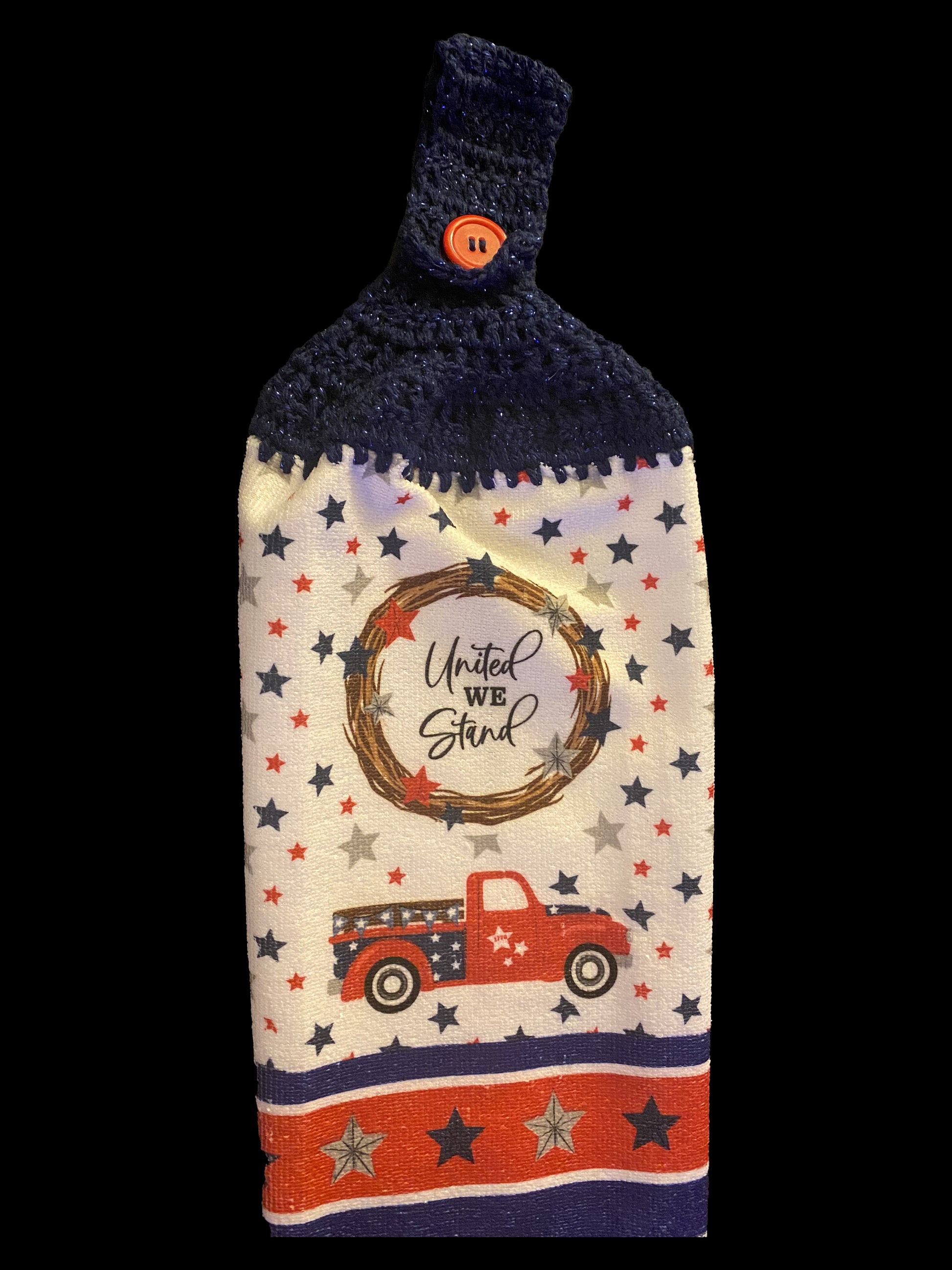 Kitchen towel with a crocheted hanger saying "United we Stand” with Patriotic Truck.