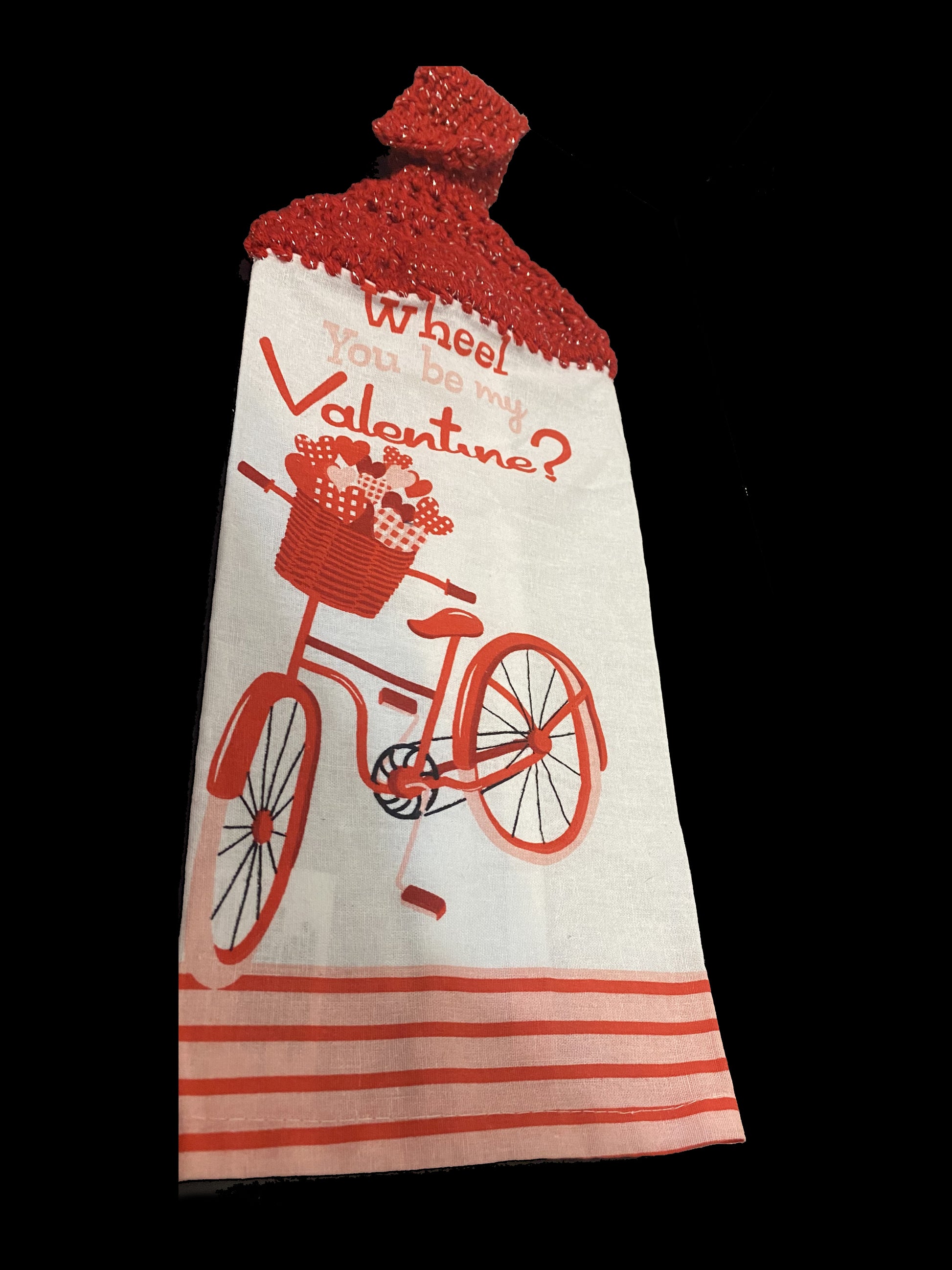 Kitchen towel with a crocheted hanger saying "Wheel you be my Valentine” with a bike with a basket of flowers.
