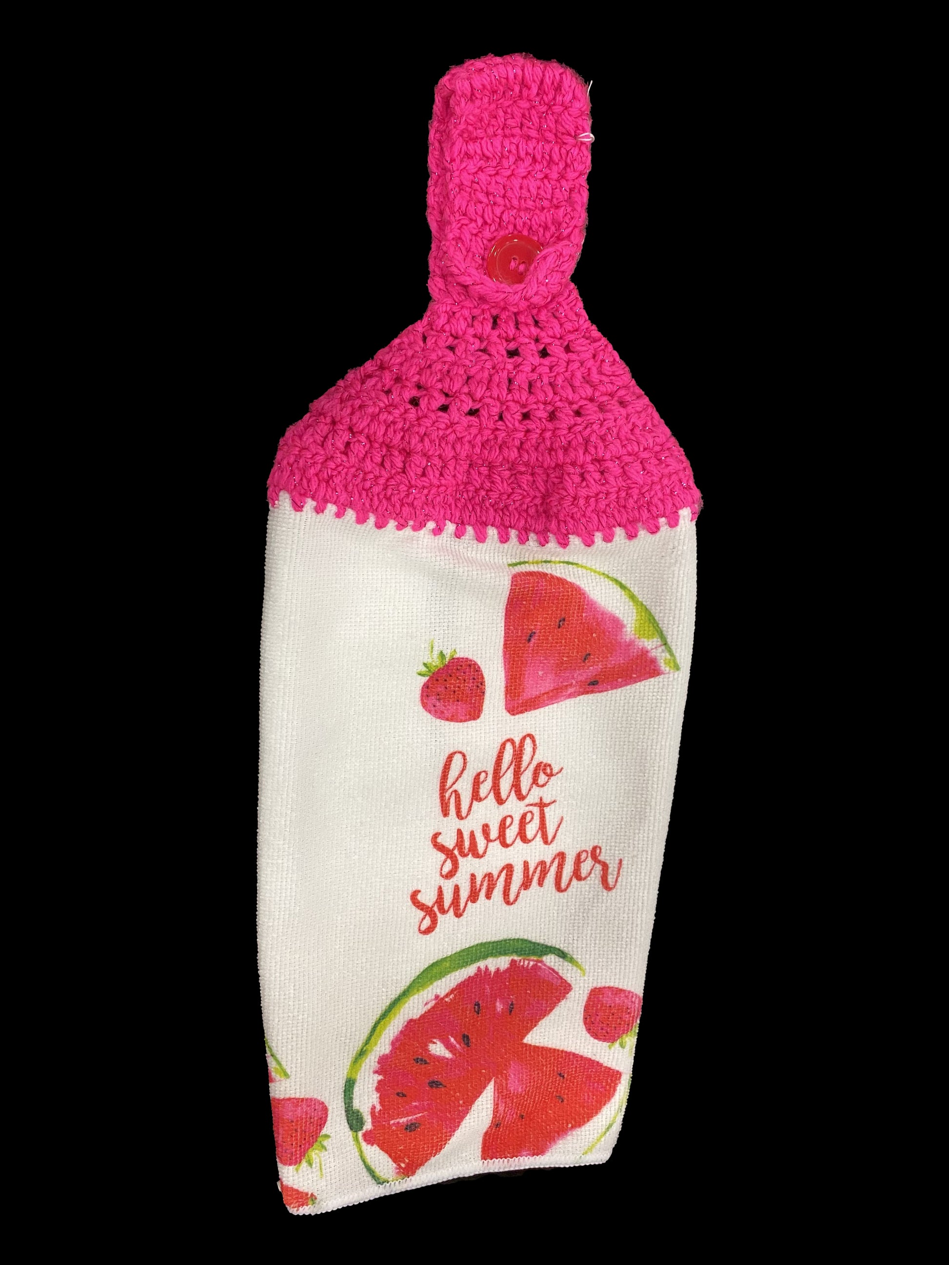 Kitchen towel with a crocheted hanger saying "Hello Sweet Summer” with watermelons.